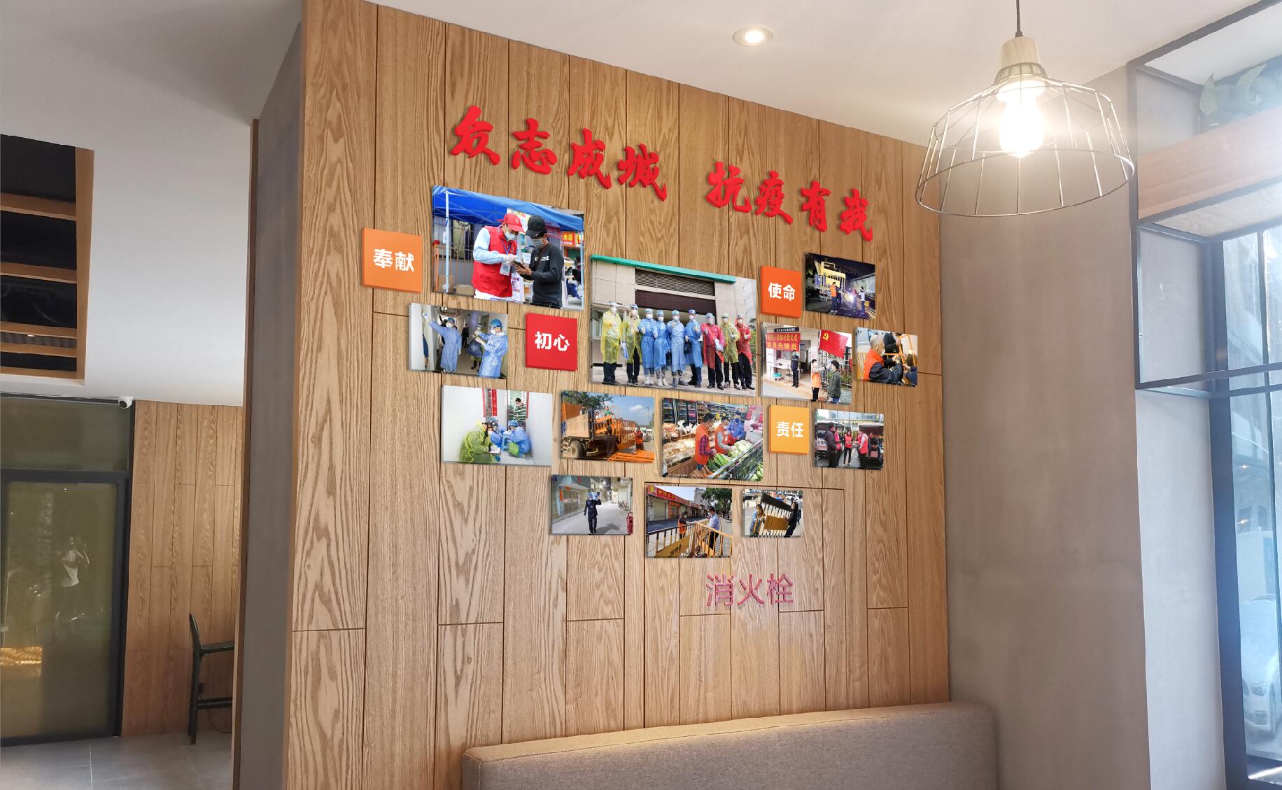 為了進一步加大疫情防控工作宣傳力度,提高疫情防控意識,有效凝聚抗疫力量,水思源設計從當時環境著手,設計出既有體現黨員職責的形象墻,全心全意為人民服務的作戰宗旨;又有緩解疫情帶來緊張感的形象墻,體現秋果酒店的人文關懷。將“不忘初心,牢記使命”堅持到底,加強疫情防控工作,增強必勝的決心和信心,把黨支部的各項防控措施切實落地工作表現出來。